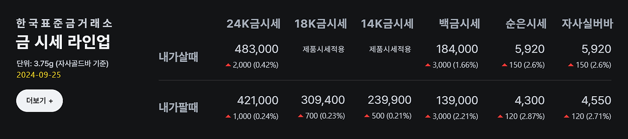 - 순금의 경우 골드바 기준으로 시세가 제공됩니다 (예: 2024년 9월 25일 골드바 매입 시세는 421,000원/돈).